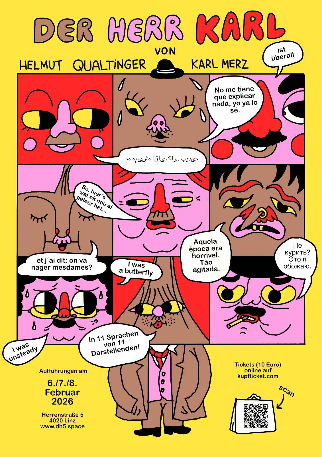 „So unruhig. De Menschen waren zornig. Verhetzt. Fanatiker,“ sinniert der Herr Karl über die schreckliche Zeit damals, geprägt von Umbrüchen, Inflation und Armut, als es die Leut massenweise in die Fänge von Populisten und Führern trieb. Das Stück könnte aktueller nicht sein! Die ältere Generation in Österreich kennt den „Herrn Karl“ noch als Skandalstück über einen österreichischen Prototyp, einen Wendehals, der sich empathiefrei durch die Untiefen seiner Zeit schlägt. Das DH5 holt den Monolog aus dem Keller und macht das Werk einem neuen Publikum zugänglich, stellt es ins Zentrum eines Dialogs über Werte und Identität, indem es in elf Sprachen von 14 Darstellenden mit Untertitel in Deutsch gezeigt wird.