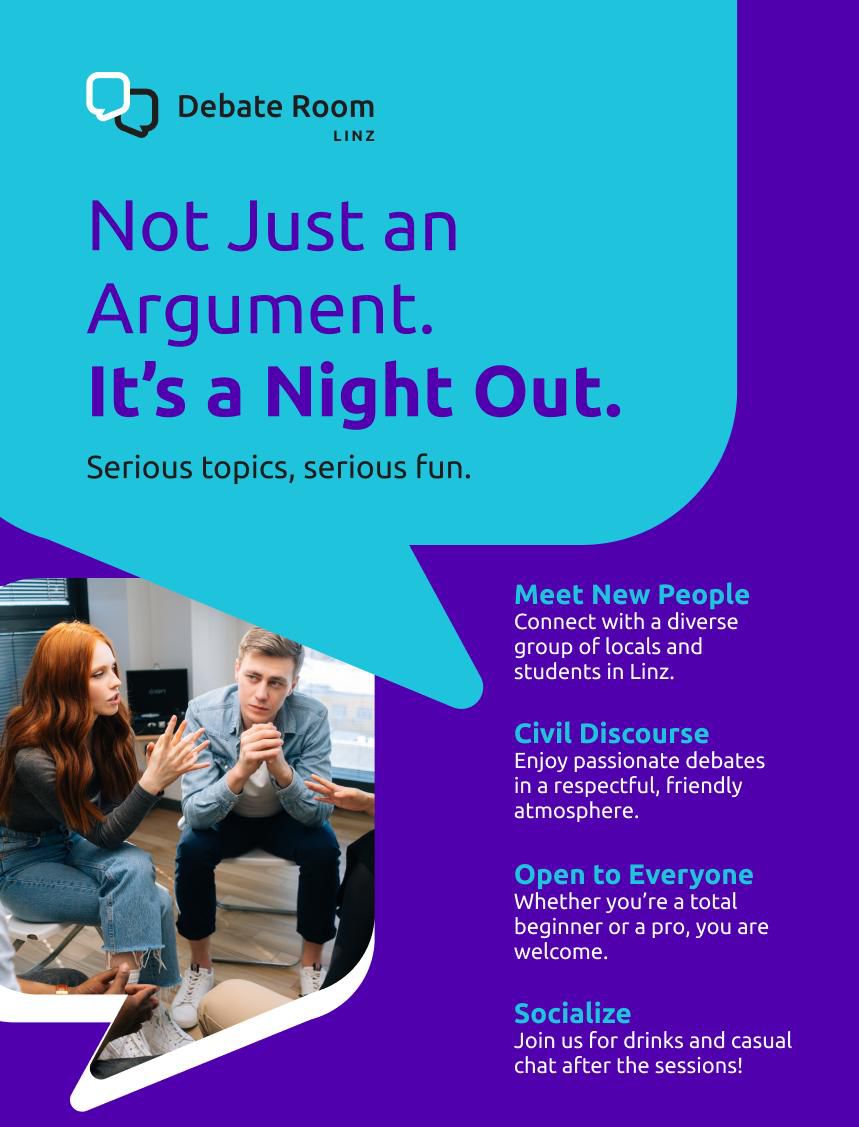 The Debate Room Linz invites participants to explore cultural, philosophical, and political questions through live debates in English.
