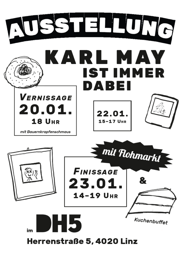 Die Ausstellung Karl May ist immer dabei ist eine fotografische Reise durch die Pfarrflohmärkte der Linzer Umgebung. Die für das Projekt verwendeten Kameras wurden zuvor auf den Flohmärkten erworben. Die Vielfalt der Arbeitsmaterialien und deren technischen Schrullen sorgen für eine komplexe ästhetische Erfahrung, die das Chaos und die Buntheit von Flohmärkten widerspiegelt.
